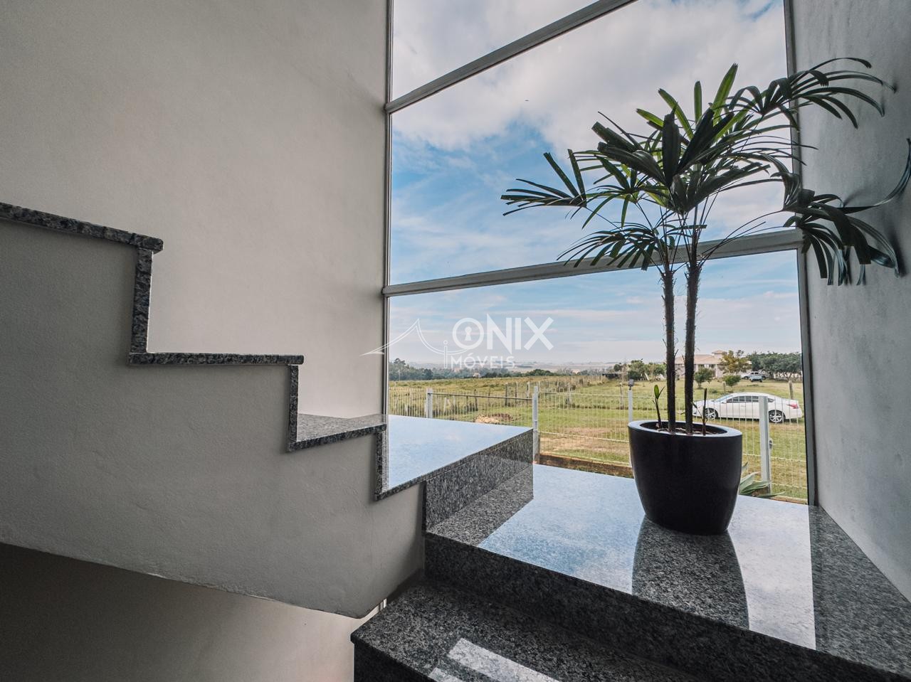 Escada revestida em granito preto;